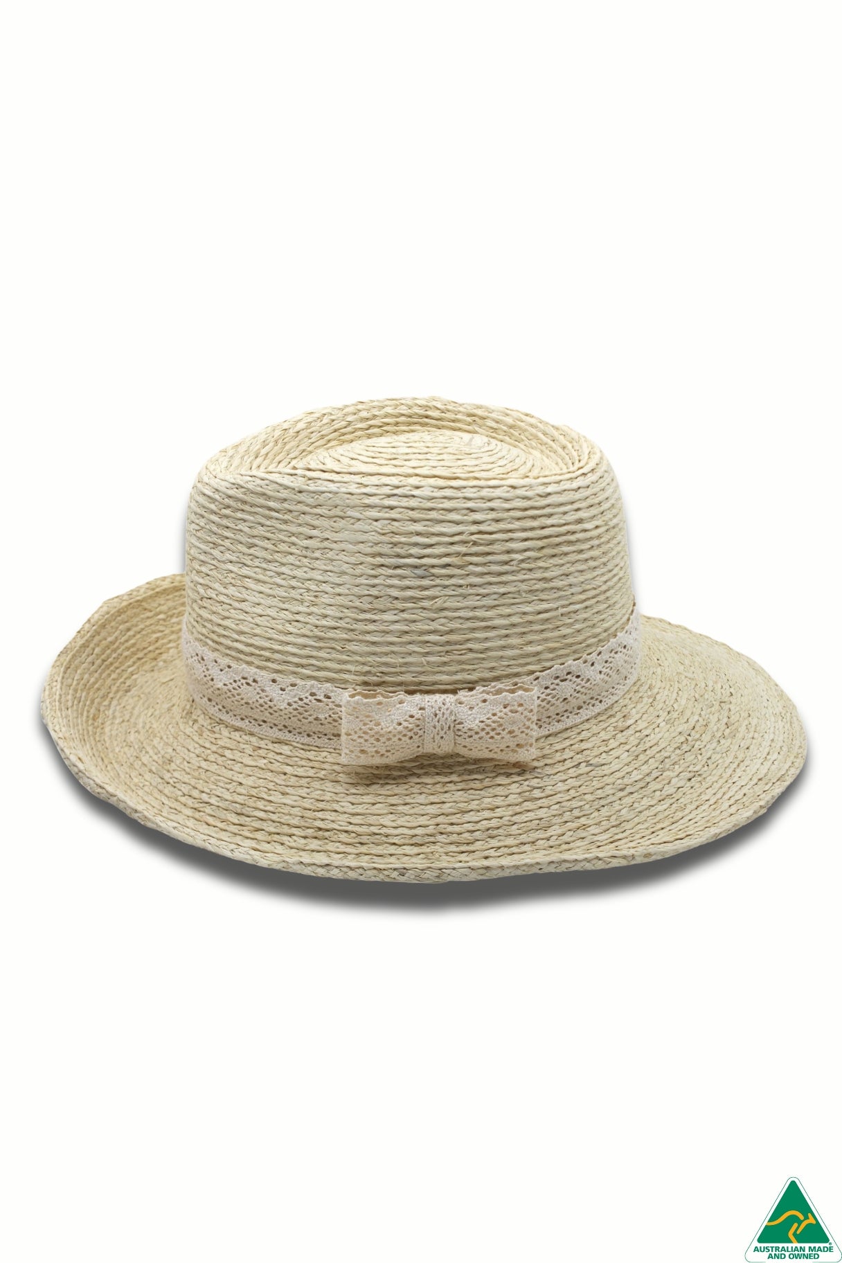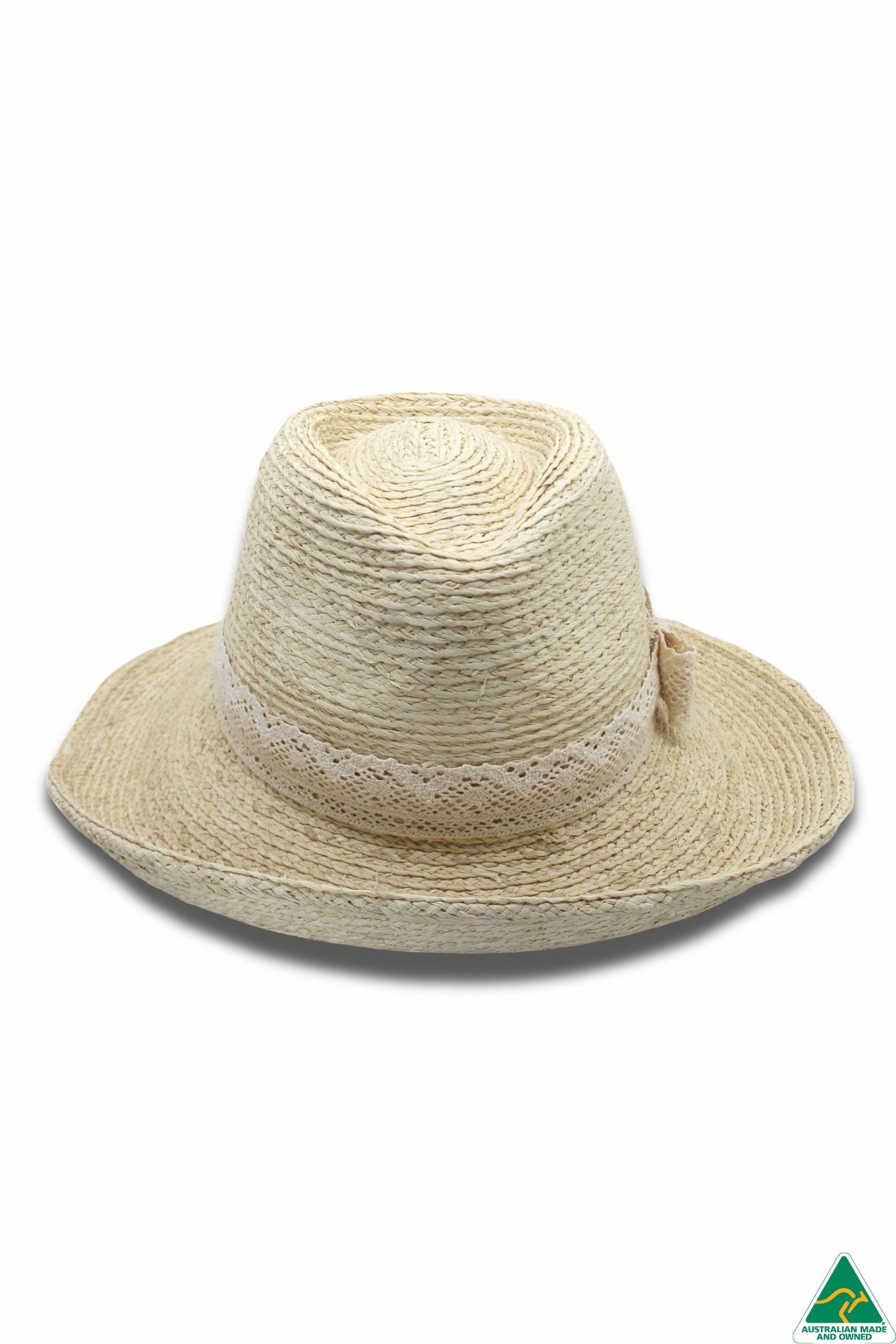 Stacey is as pretty as a picture! An oversized trilby style with a twist - the brim turns up at the front! Made from Raffia Braid, and featuring a dainty lace band and bow, this hat offers exceptional UPF50+ sun protection. Internal ComfyFit adjustment ensures the perfect fit.