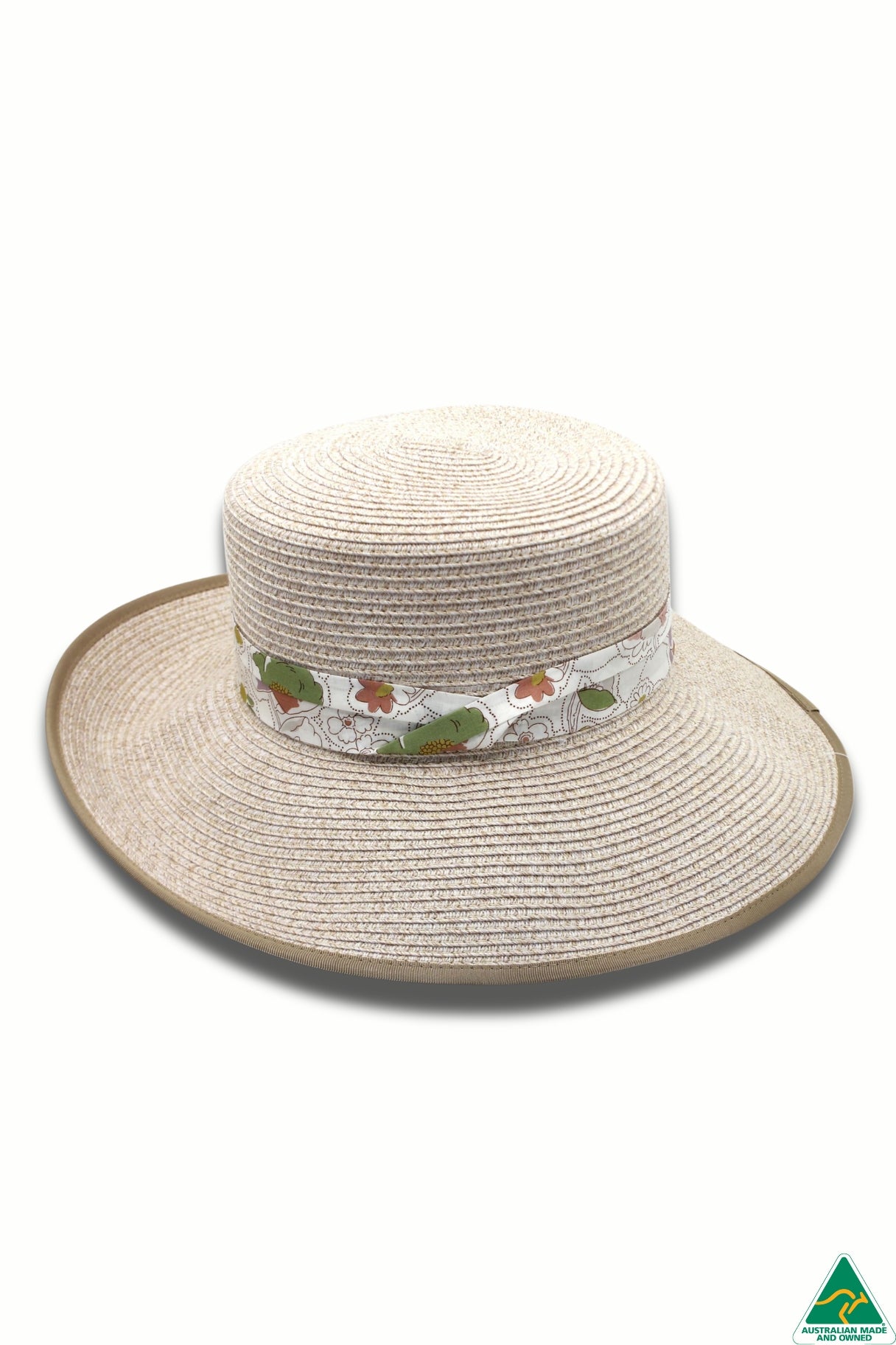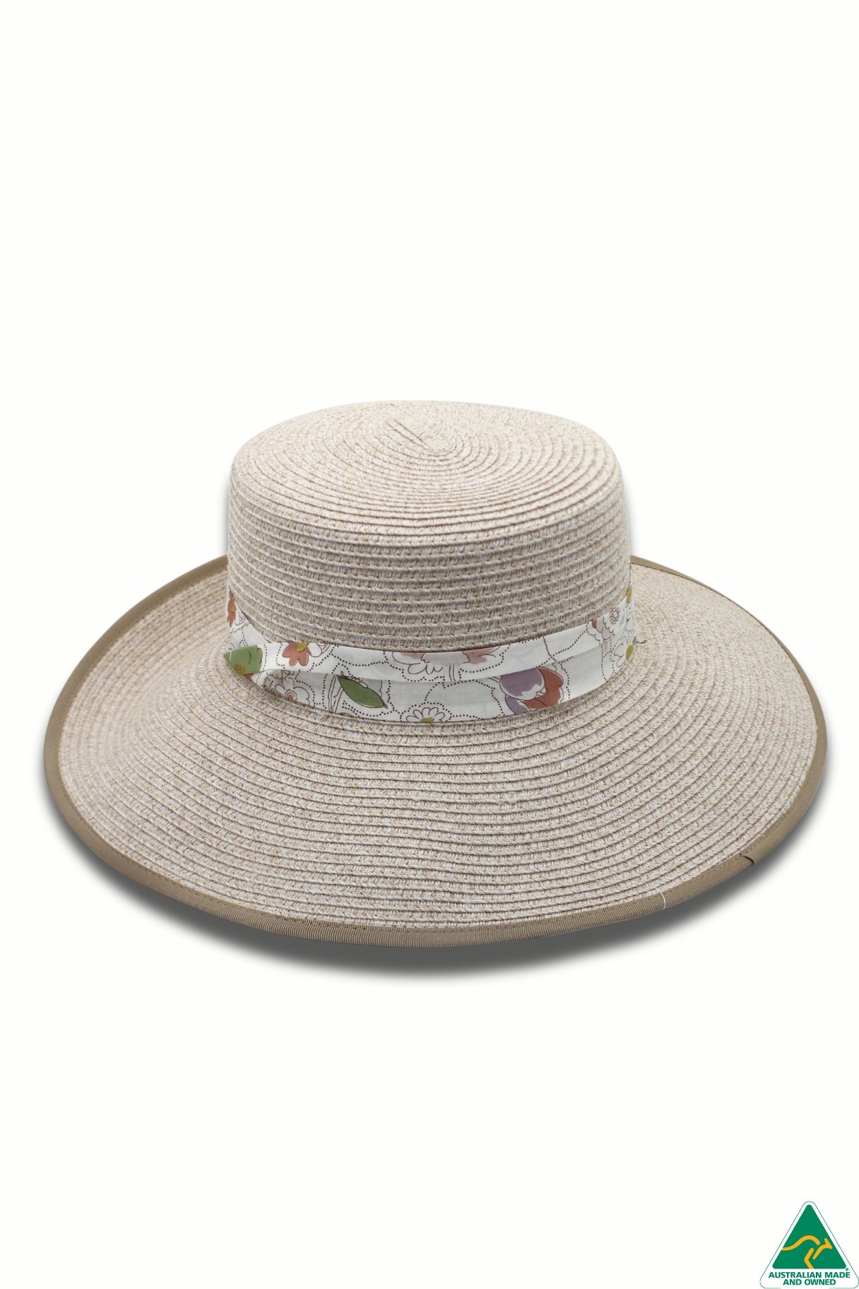 Ashley, with a delightful Liberty floral puggaree band, is made from a mixed camel Flexibraid® with a beige contrasting ribbon edge. A unique reverse trilby style brim with a flat crown, UPF50+ sun protection and an internal ComfyFit adjuster to ensure the perfect fit. Travel friendly and proudly Australian made.