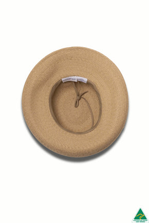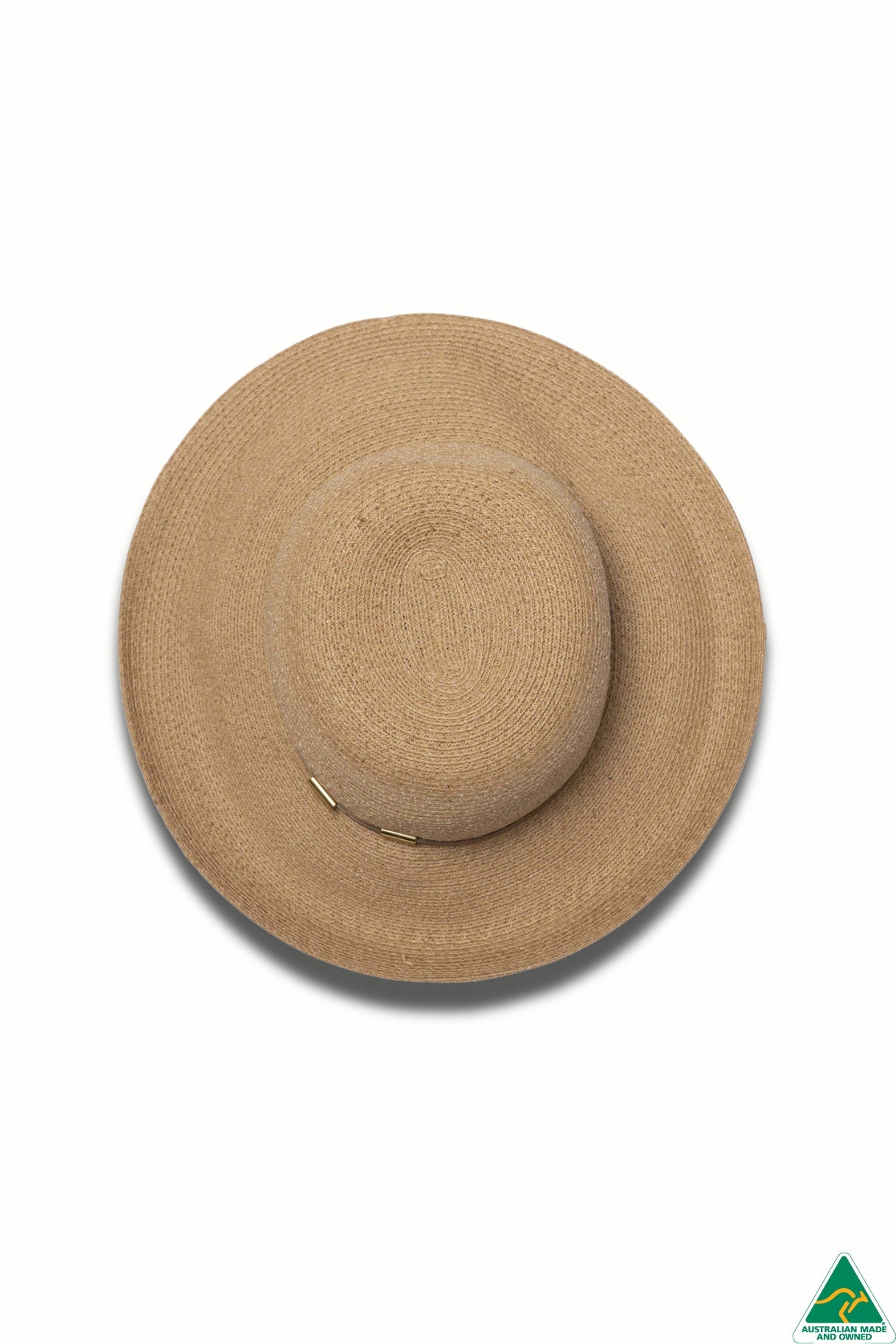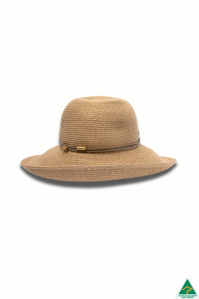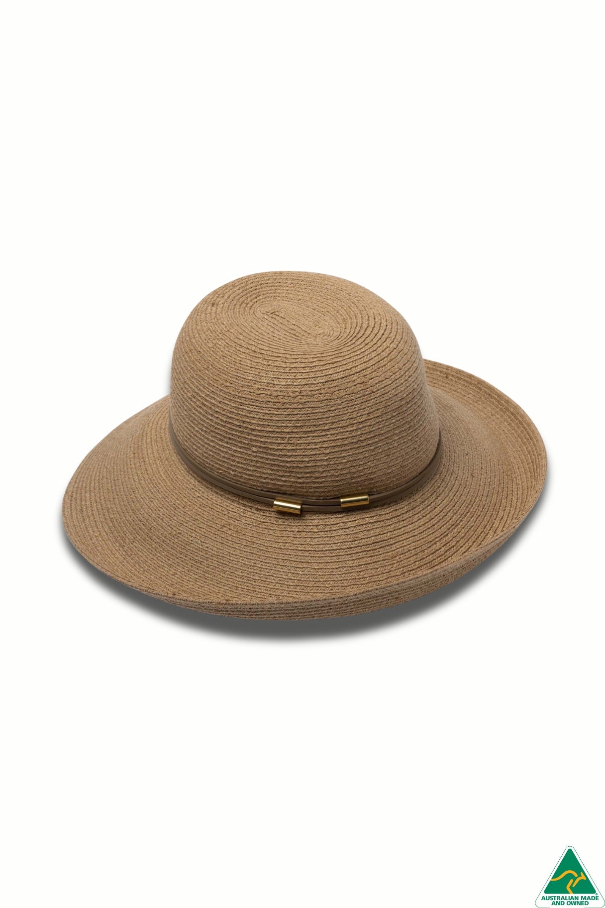 The Hamilton is a stunning signature style from Deborah Hutton. The Hamilton is handmade using a unique Madagascan Raffia, which is woven into a braid providing UPF 50+ sun protection. The design is finished with a 5mm khaki leather rope extending twice around the crown and secured with 2 delicate brass buckles at the front.